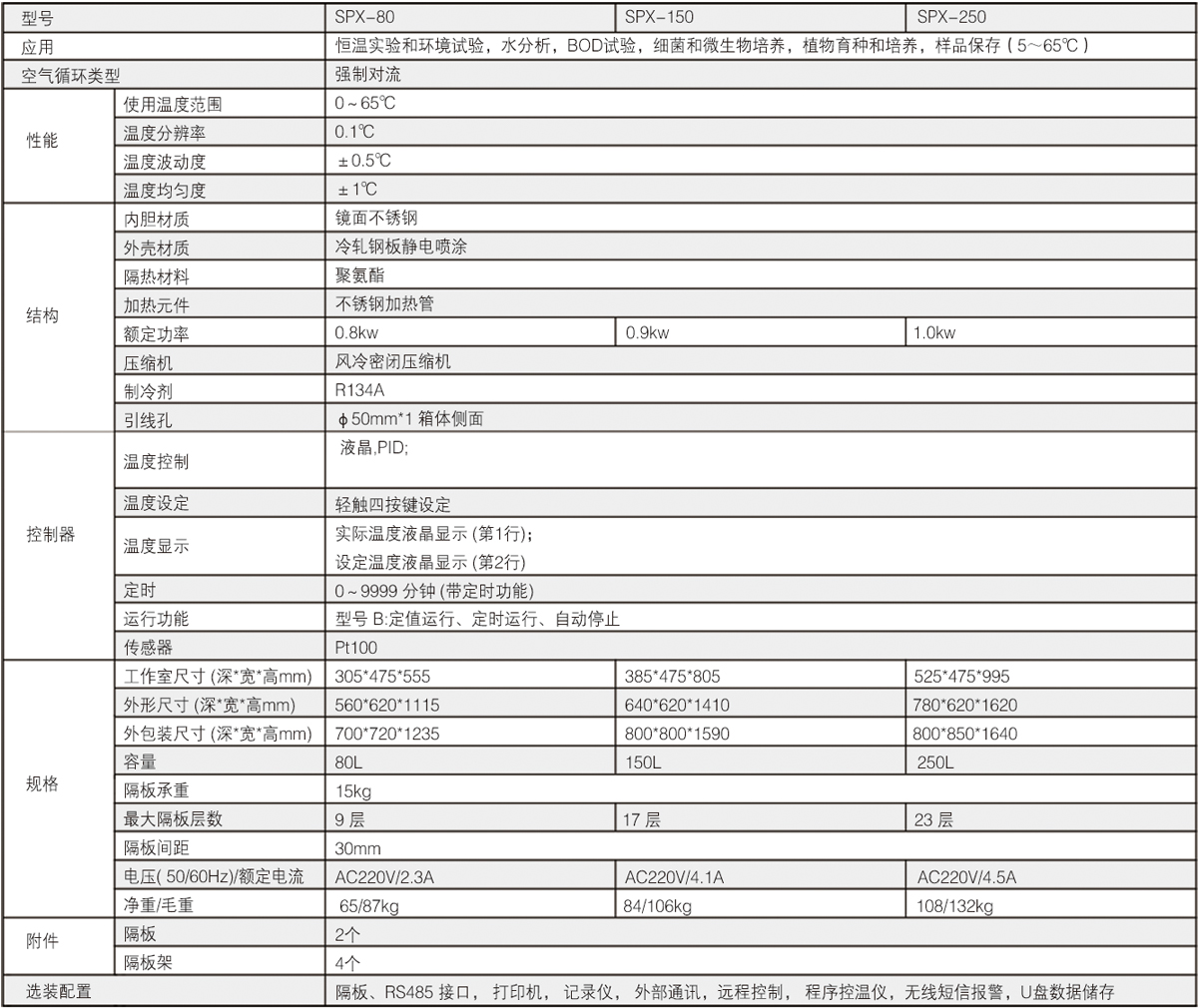 外殼采用優質冷軋鋼闆制作,表面靜電噴塗工藝,漆膜牢固,造型美觀。 采用鏡面不鏽鋼内膽,四角半圓弧設計,易清潔,箱内隔闆間距可調。箱體左側裝有∅50測試孔便于用戶檢查和外接内置設備引線。 箱門采用雙門設計保溫效果理想,打開外面大門可通過内置大玻璃門和照明裝置觀察工作室物品情況,視野寬廣。 微電腦溫度控制器,可對溫度和時間進行設定調節,控溫精确,溫度調節方便,示值準确直觀,性能可靠,整體造型美觀,大方,使用維修方便。時間設定範圍爲:0-9999分鍾。 制冷系統采用優質壓縮機。 按用戶要求在訂貨前可加置打印機和RS-485/232接口。