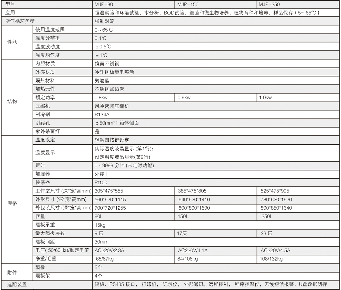 外殼采用優質冷軋鋼闆制作,表面靜電噴塗工藝,漆膜牢固,造型美觀。 采用鏡面不鏽鋼内膽,四角半圓弧設計,易清潔,箱内隔闆間距可調。箱體左側裝有∅50測試孔便于用戶檢查和外接内置設備引線。 箱門采用雙門設計保溫效果理想,打開外面大門可通過内置大玻璃門和照明裝置觀察工作室物品情況,視野寬廣。 微電腦溫度控制器,可對溫度和時間進行設定調節,控溫精确,溫度調節方便,示值準确直觀,性能可靠,整體造型美觀,大方,使用維修方便。時間設定範圍爲:0-9999分鍾。 制冷系統采用優質壓縮機。 按用戶要求在訂貨前可加置打印機和RS-485/232接口。