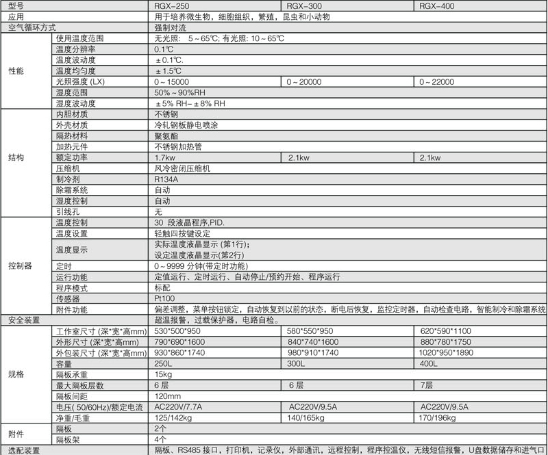 外殼采用優質鋼闆制作,表面靜電噴塗漆膜牢固,造型美觀、工作室采用優質鏡面不鏽鋼闆制作,抗腐蝕、耐老化、四角圓弧設計,易于清潔、無衛生死角,工作室内隔闆可随意調節高度,使用戶操作更簡便。 微電腦程序控制溫度、濕度、光照度、可設30段程序,每段設置時間範圍1-99小時,可以模拟白天和黑夜的溫度、濕度變化,可選擇生長溫度環境充足的光源,可模拟大自然多方向性的光源,高度液晶顯示屏,周期段數、時間、溫度、濕度、光照度等一目了然。 安全性能可靠,儀表具有多種抗幹擾措施,并具有超溫報警保護,參數記憶來電恢複,壓縮機延時保護等功能。 箱門采用雙門設計保溫效果更理想,打開大門可通過内置玻璃門和照明裝置觀察工作室的物品情況,視野更寬廣. 箱體内有冷、熱氣流風道,有風機運轉加強氣體循環流暢,提高工作室内的溫度均勻性。 選用高精度濕度傳感器,避免幹濕球頻繁更換。 設備背面上方有電源線保險插座,下方有放水閥,溢水口,外置加水,并配有加水水桶。 光照度6級可調。 采用優質壓縮機,環保型制冷劑(R134a)高效率,低能耗,促進節能。 根據用戶需要在訂貨前可加置打印機和RS-485/232接口。
